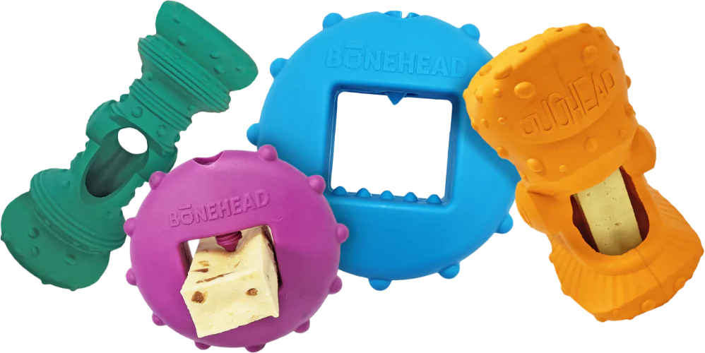Curated with creative pups in mind. Simply insert a chew or treat into our Bonehead and Jughead toys to slow down chew time & make treats last longer while also making them easily accessible for paws of any size!
