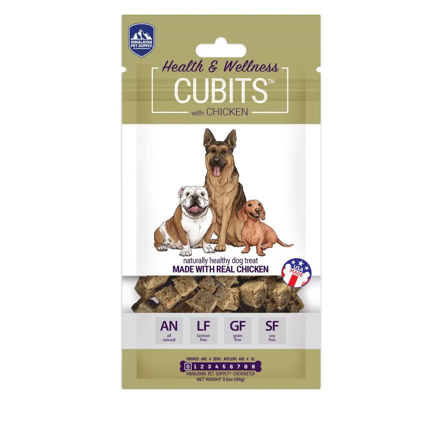 Cubits® Chicken is a health and wellness treat for dogs. These health-conscious, chicken treats are a great source of protein which provides dogs with lots of energy. Chicken is a good source of omega 6 fatty acids which are good for the skin and coat and has essential amino acids and glucosamine for healthy bones. Cubits® are made with the finest natural ingredients, with no artificial flavors or preservatives, and are lactose, grain, corn, soy, and gluten-free. These treats are as nutritious as they are tasty. Himalayan Pet Supply Cubits® are the perfect training treat for your dog. These protein-rich morsels are small and robust providing your dog with a savory, healthful, natural treat. An excellent mini bite for trainers, handlers, and dog lovers alike. For dogs of all ages and sizes; from puppies to seniors.